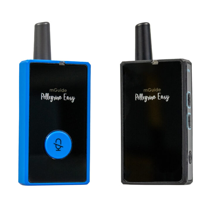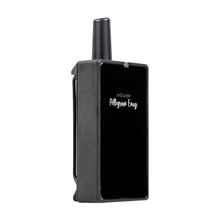 Lo que distingue al mGuide Pellegrino Easy de la competencia son sus dimensiones excepcionalmente compactas y su reducido peso. Los dispositivos pesan solo 45 gramos, lo que los hace increíblemente cómodos de llevar y prácticos para un uso prolongado, como en visitas guiadas. La comodidad se ve reforzada por un práctico clip que permite sujetar fácilmente el equipo a la ropa.